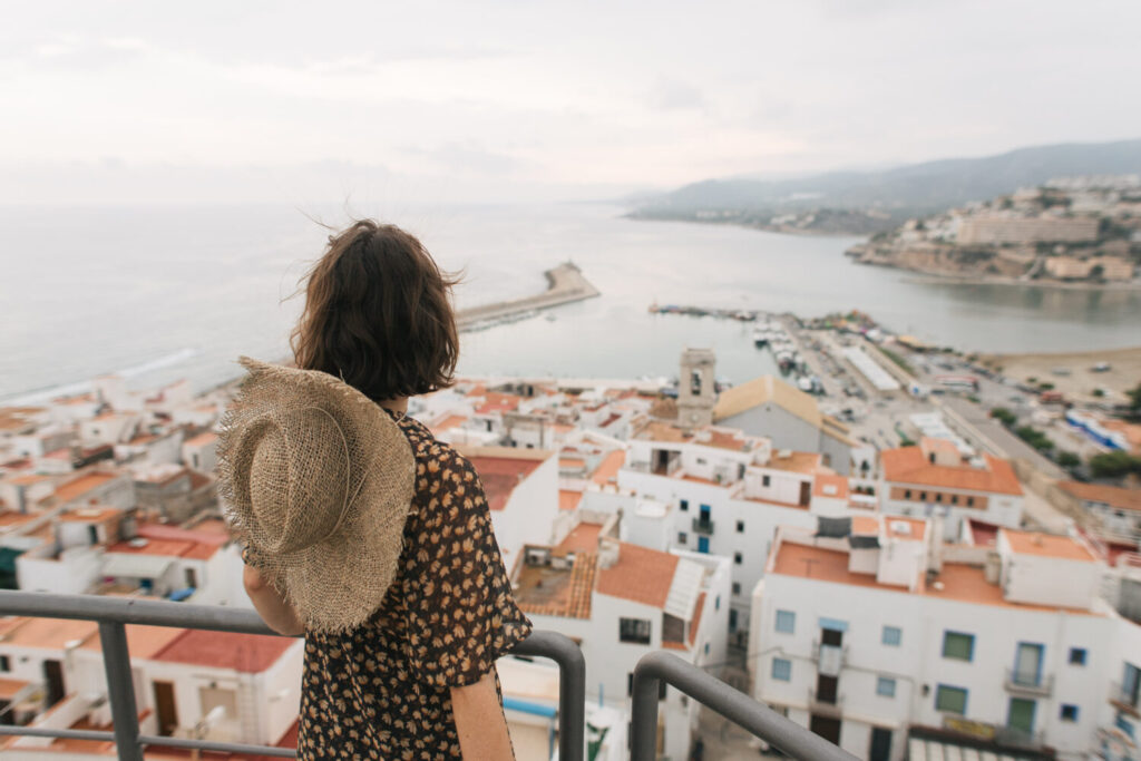 joven viajera se alza sobre el castillo, vista a la ciudad, Peniscola España