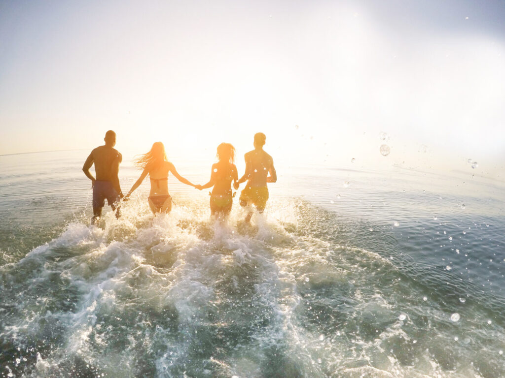 Jóvenes amigos corriendo al mar al atardecer – Concepto de libertad y vacaciones – Gente divirtiéndose dentro del agua del océano en vacaciones de verano con el sol de fondo – Filtro cálido con viñeta suave