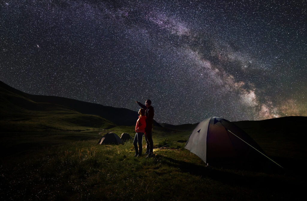 Jóvenes caminantes de pareja cerca de las carpas en la noche acampan bajo el cielo estrellado contra el telón de fondo de las montañas cubiertas de vegetación y lago. Hombre señalando el cielo estrellado de la noche y la Vía Láctea