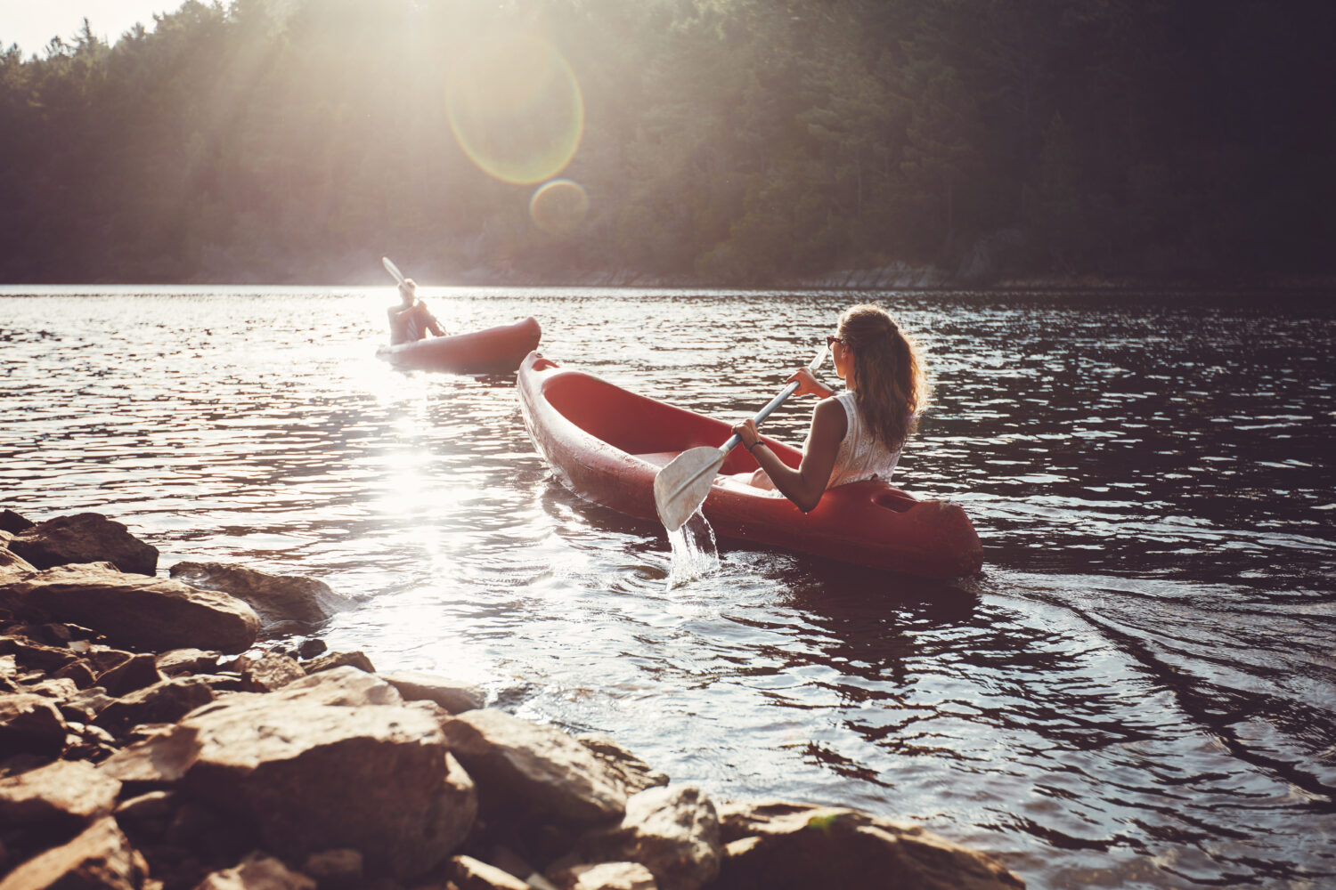 jovenes haciendo kayak en un lago joven y mujer remando