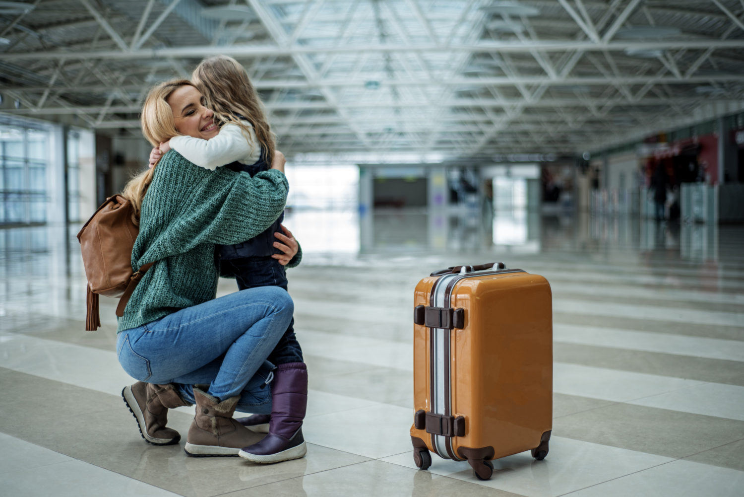 Joyful mommy meeting little daughter after long flight. They are in a strong hug