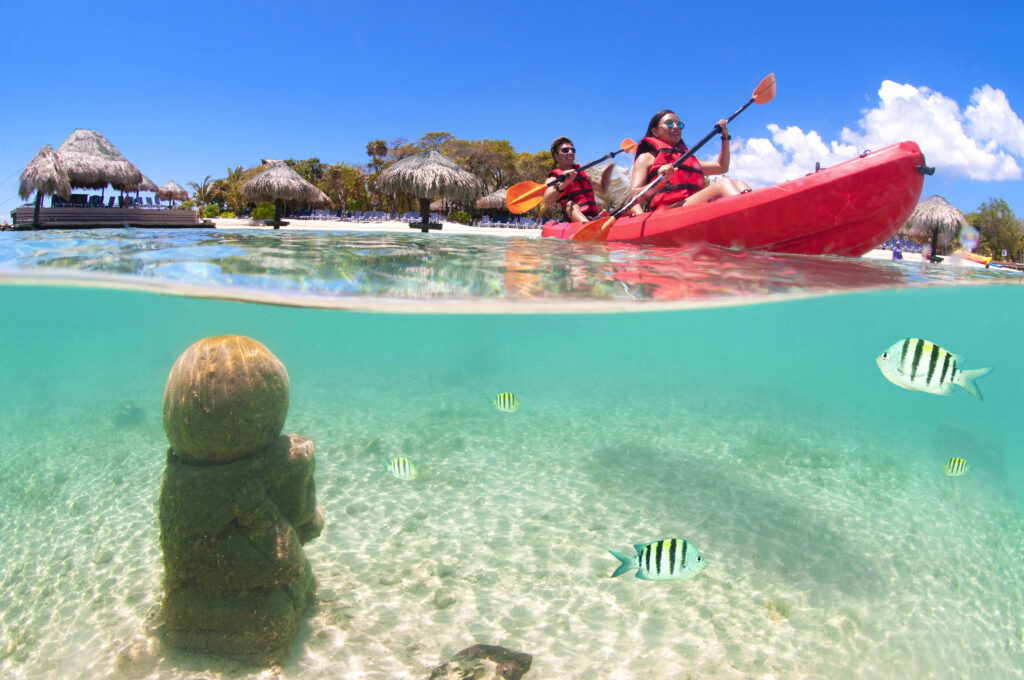 Young couple canoeing over a submerged mayan ruin