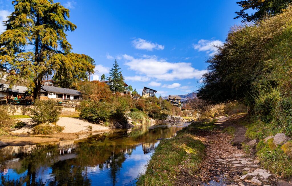 La Cumbrecita, Córdoba, Argentina. Vista del paisaje invernal desde la orilla del río Medio. Cumbrecita ciudad completamente peatonal