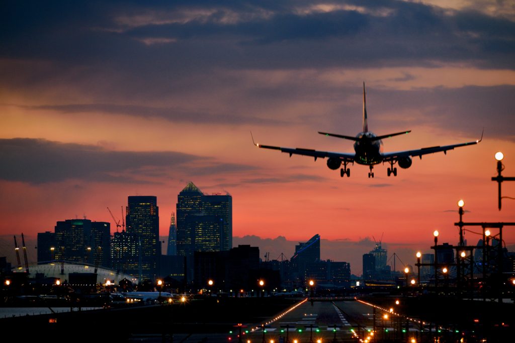 Landing airplane at dusk