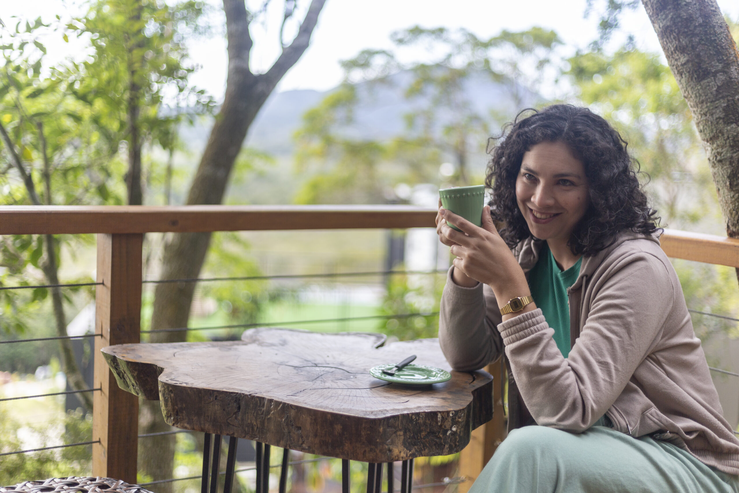 Latin woman drinking coffee on veranda with greenery ID: 74948 Latin woman drinking coffee on veranda with greenery