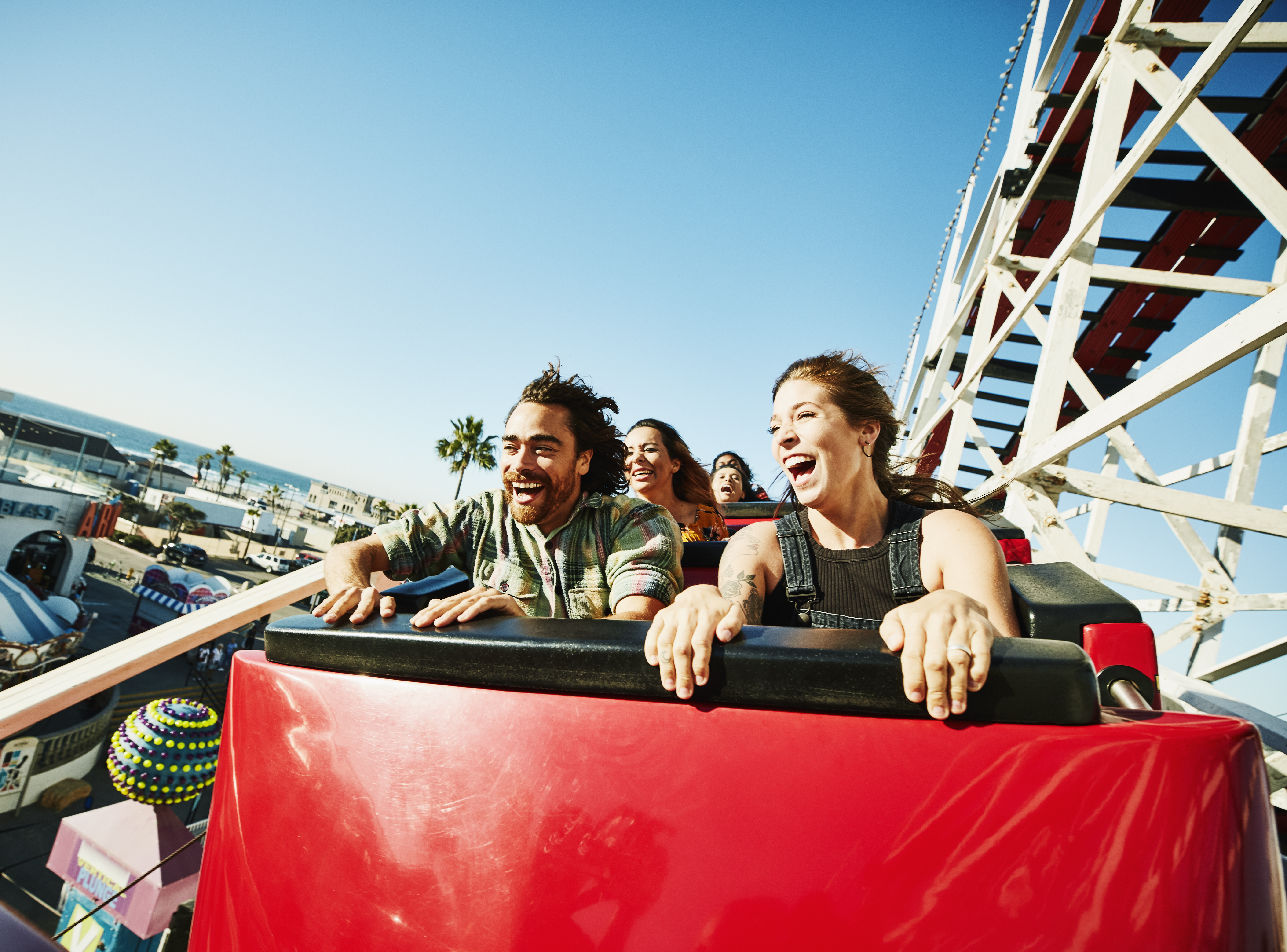 Laughing and screaming couple riding roller coaster at amusement park