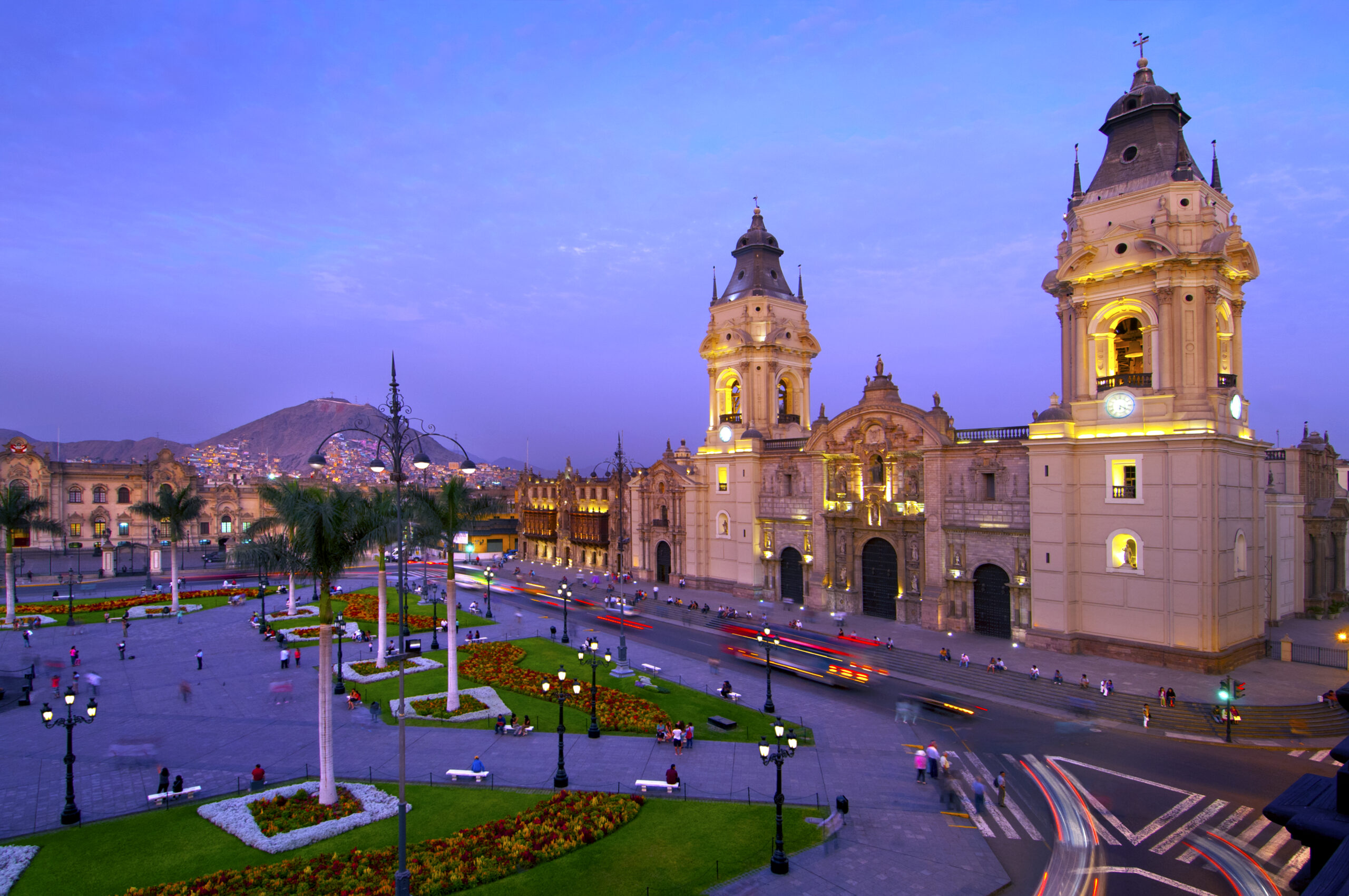 The Cathedral of Lima (Cathedral de Lima), is a Spanish colonial style church located on the Plaza Armas (also known as Plaza Mayor) in downtown Lima, Peru. Cerro (hill) San Cristobal can be seen in the background.