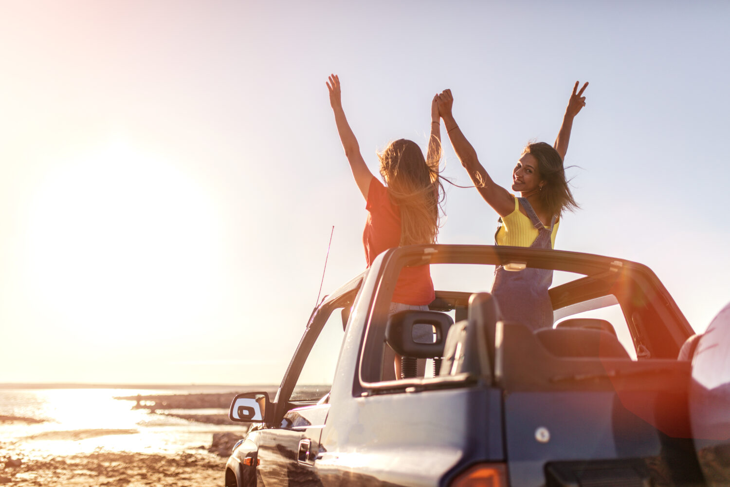 lindos amigos disfrutando de una puesta de sol en la playa pasando un buen rato sonriendo