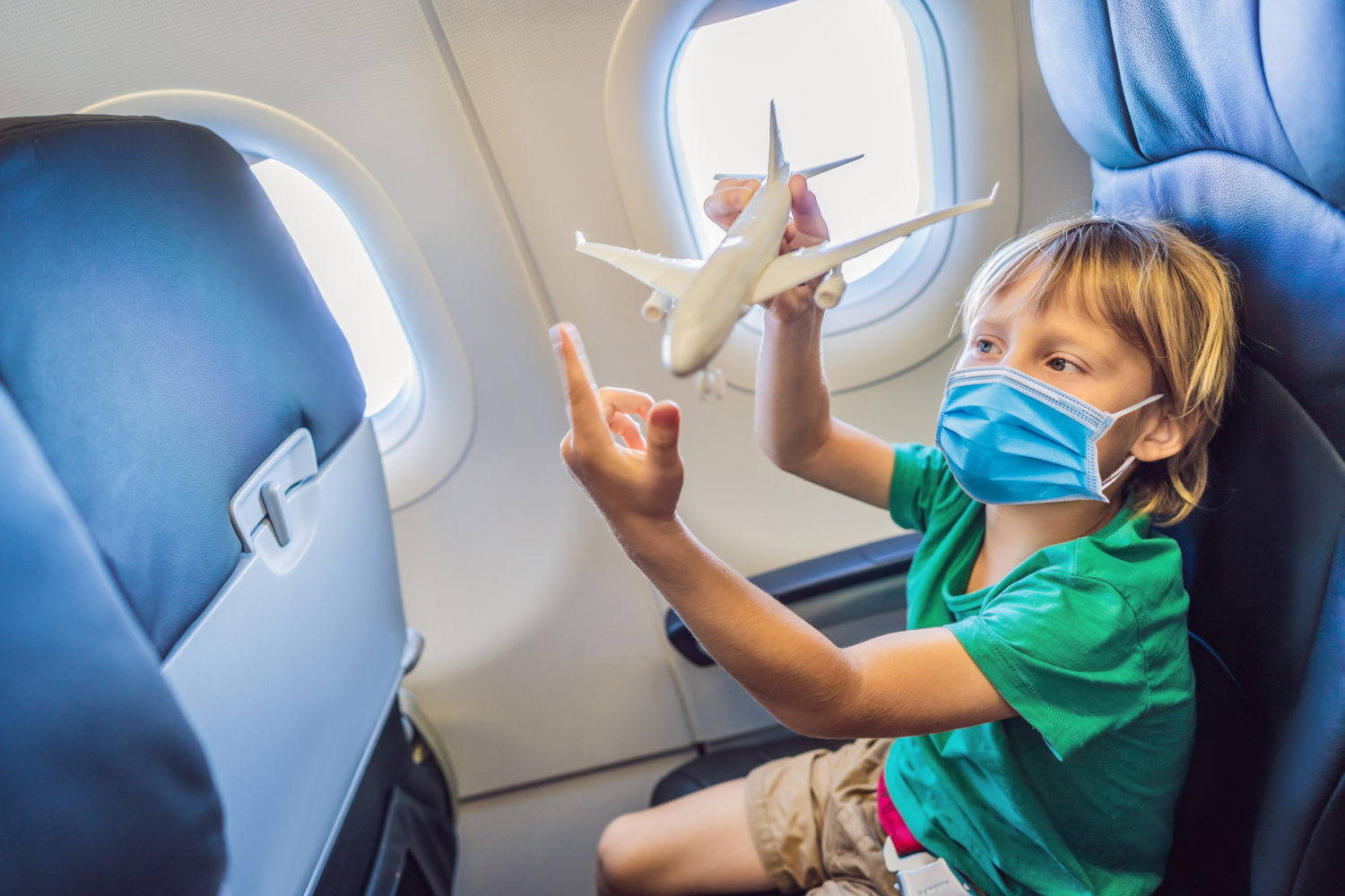 Little boy in medical mask play with toy plane in the commercial jet airplane flying on vacation Tourists fear the 2019-ncov virus. Medical masked tourists