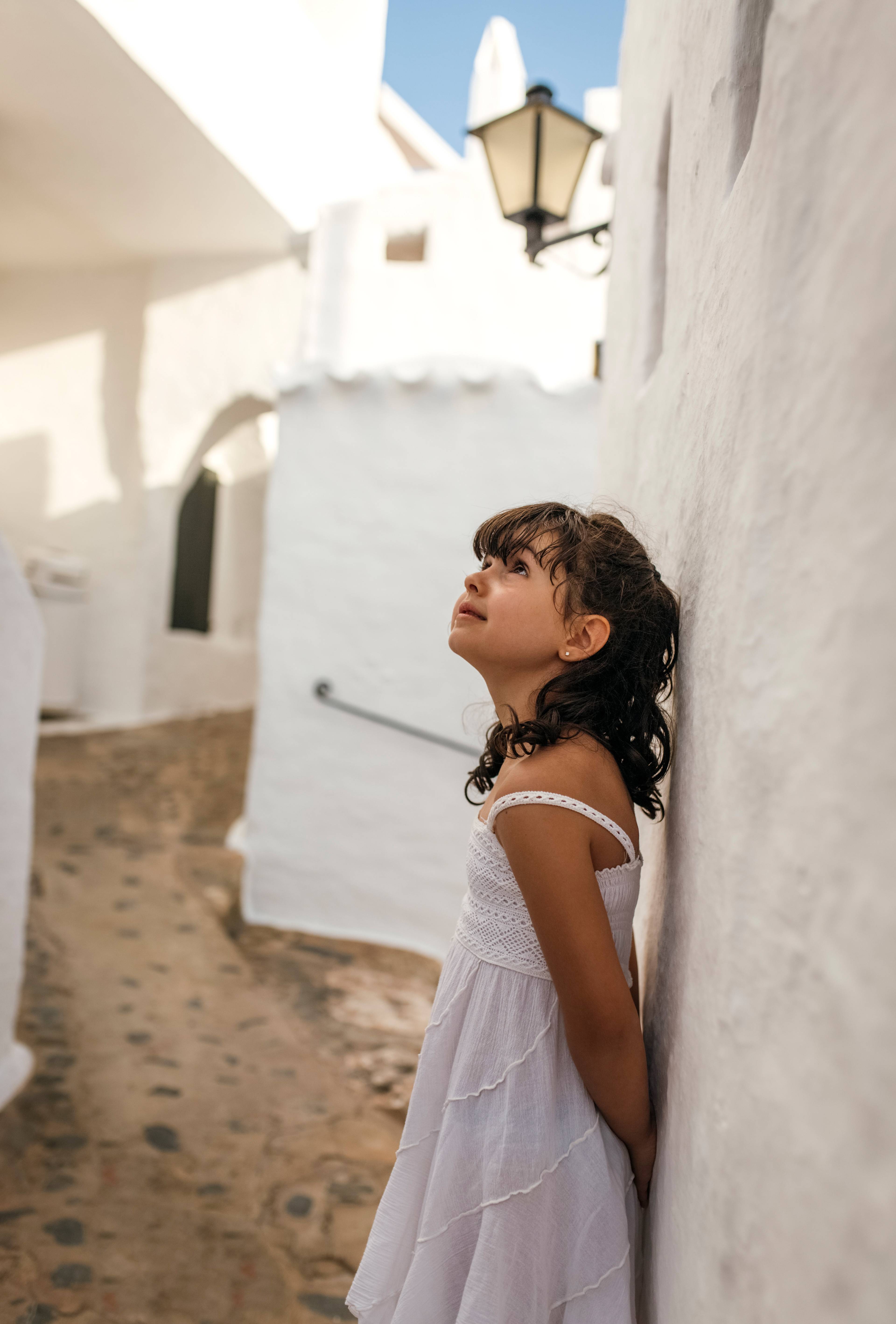 Little girl leaning against facade looking up