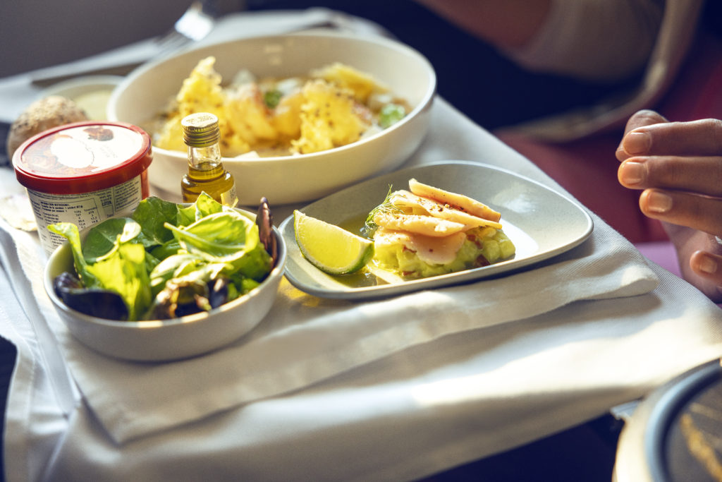 Locos laminados con salpicón de papas y limón + Mini ensalada + Plato signature: Langostinos salteados, locro de zapallo con queso fresco y habas tiernas + Panes + Mantequilla + Chocolate + Helado