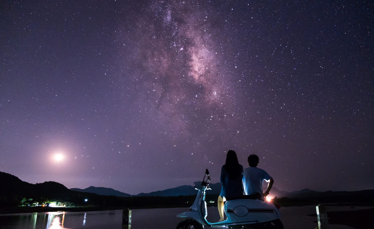 Los amantes se alegran por la noche con la Vía Láctea y las estrellas en el hermoso cielo nocturno.