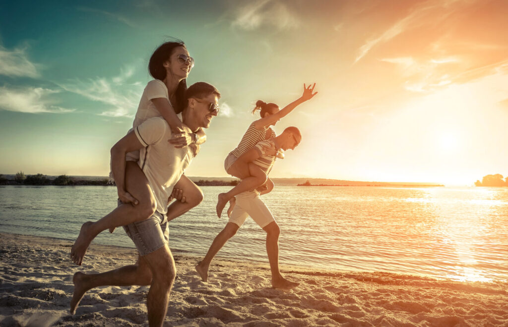 Los amigos se divierten en la playa bajo el cielo atardecer con nubes en el día soleado.
