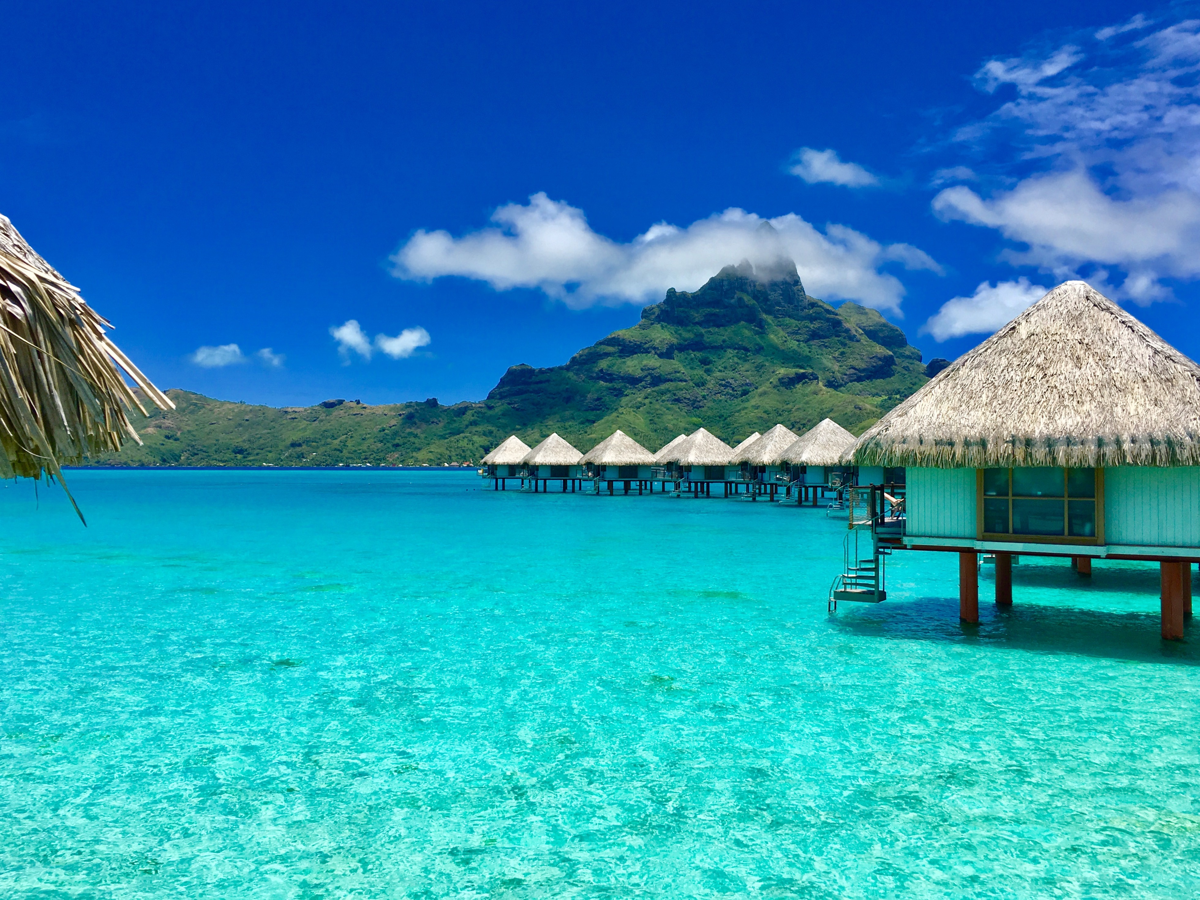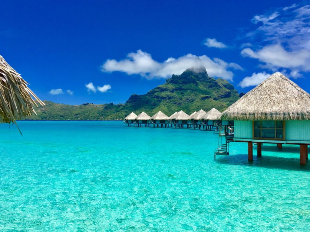 Los bungalows sobre el agua de un complejo de lujo ofrecen vistas a Otemanu, Bora Bora, Tahití y la Polinesia Francesa