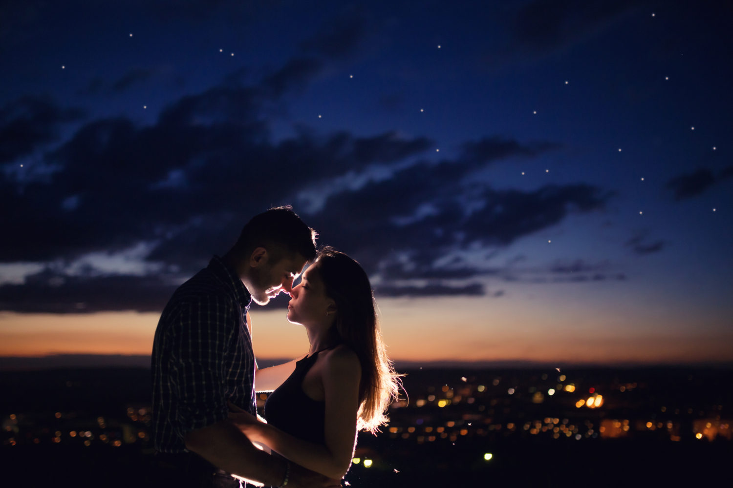 Lovers man and girl against background night city, night starry sky and horizon. Concept date Valentine’s Day, first kiss love, forever together.