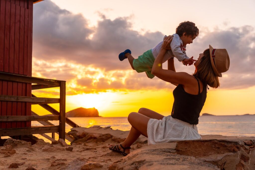 Madre divirtiéndose con su hijo al atardecer en la playa de Cala Comte en la isla de Ibiza. Balear