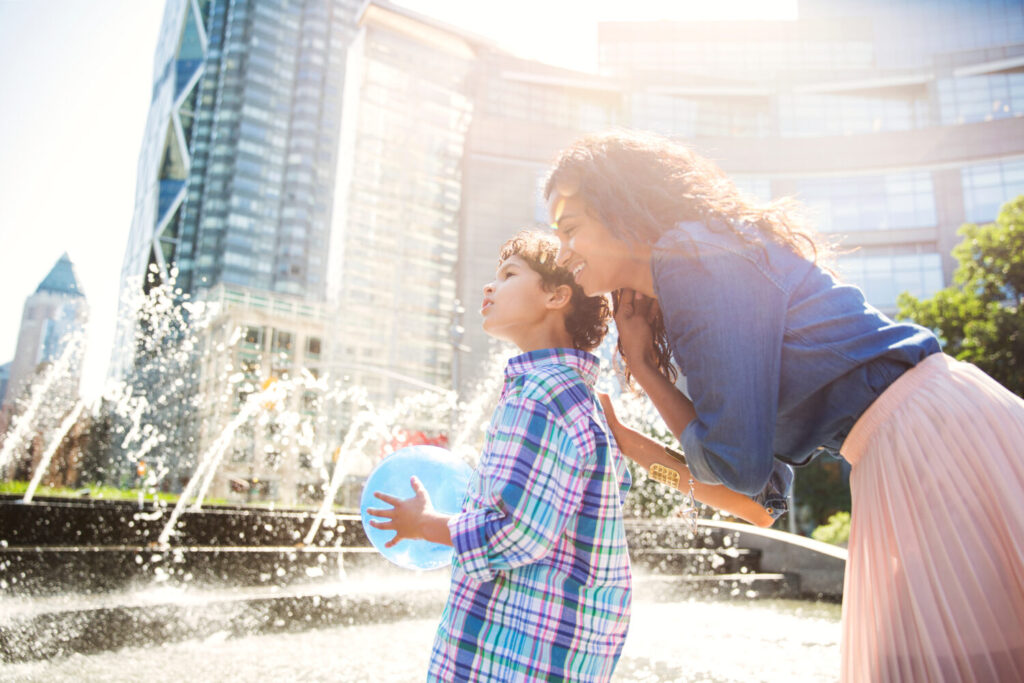 madre e hijo cerca de una fuente urbana