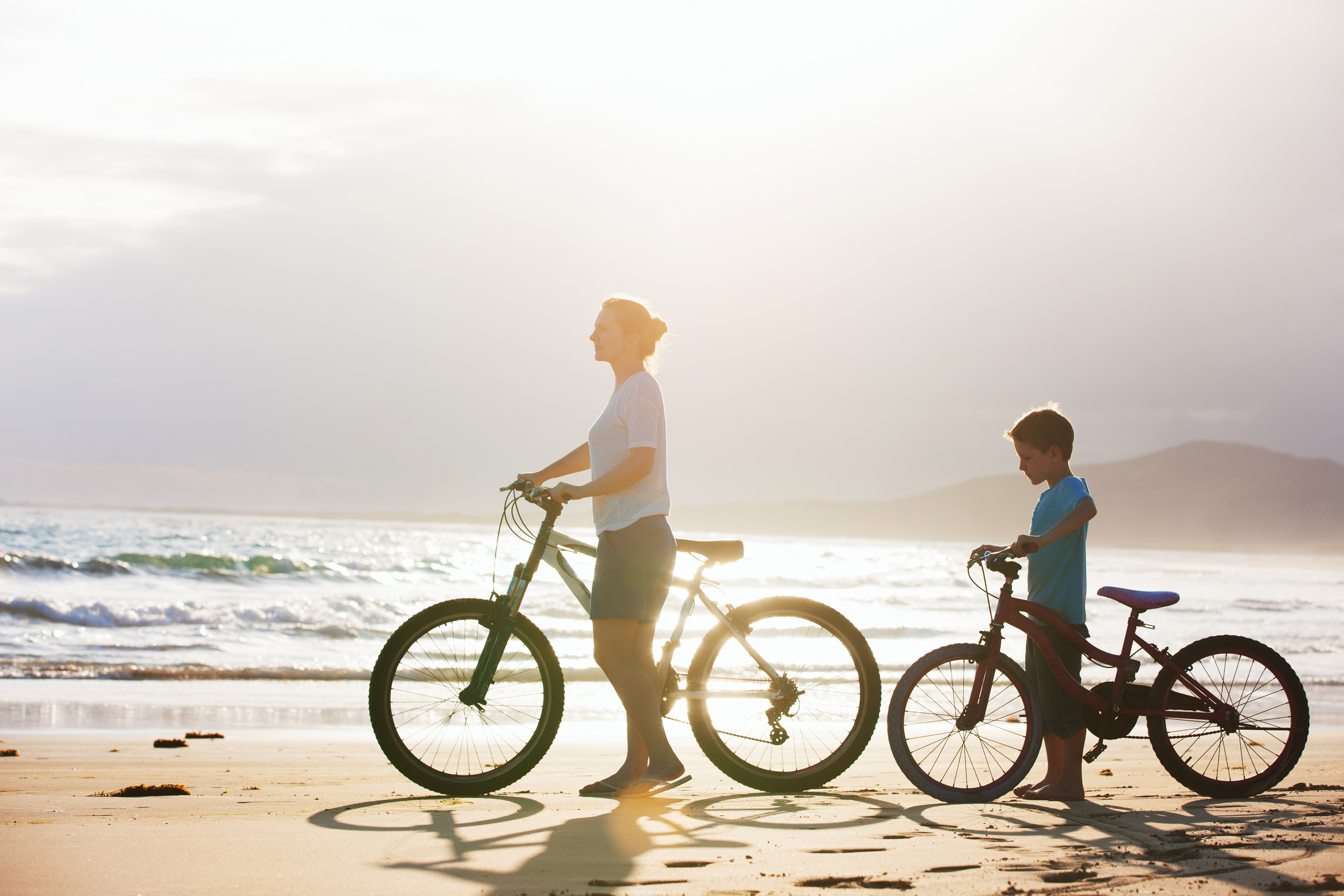 madre e hijo con bicicletas en la playa al atardecer ID: 91111 Madre e hijo con bicicletas en la playa al atardecer
