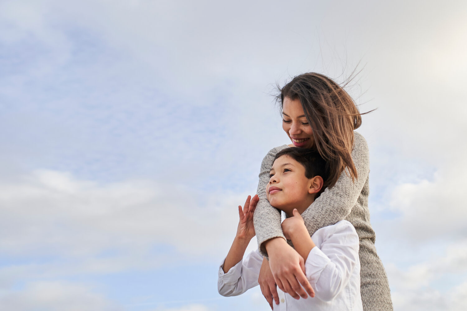 madre joven abrazando a su hijo fondo azul del cielo