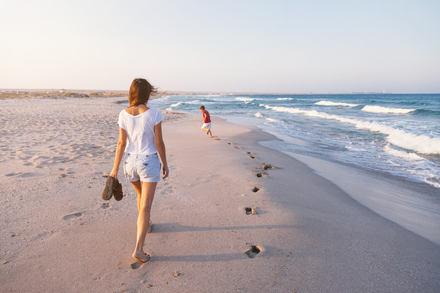 Mamá y su hijo de 8 años caminan y juegan en la playa de la puesta de sol