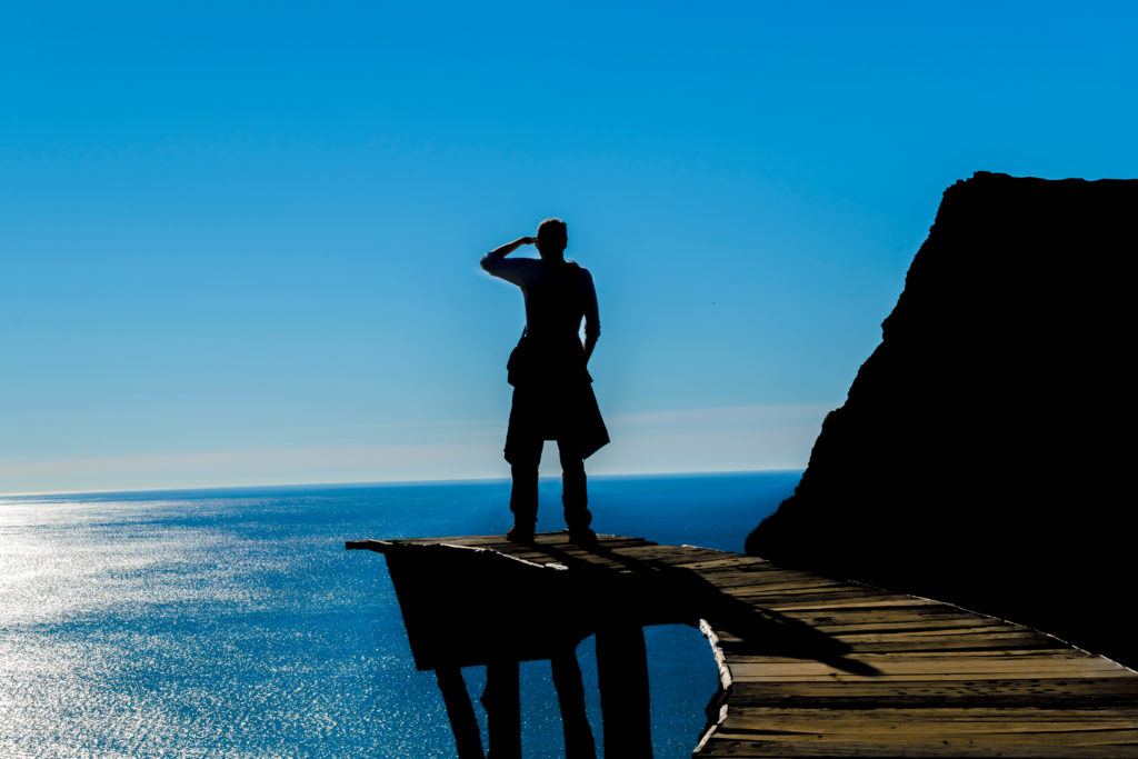 Man at border of precipice at famous Mirador de las Almas viewpoint, Chiloe Island, Chile