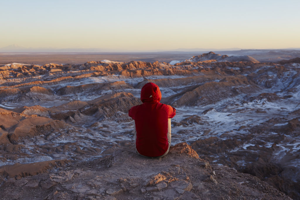 Man in a hoodie watching a sunset from a cliff in a desert valley