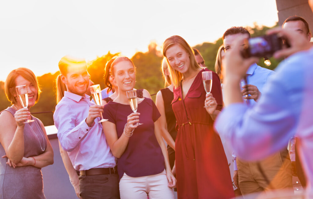 Man photographing colleagues drinking champagne and celebrating success in rooftop party with yellow lens flare