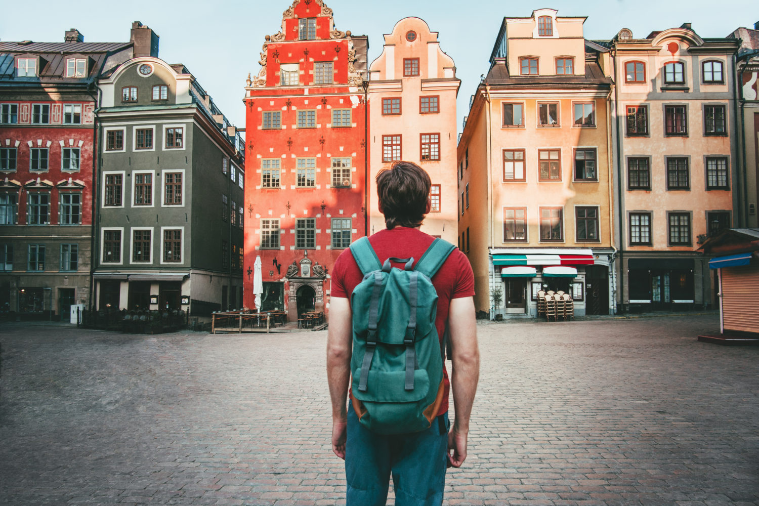 man tourist walking in stockholm travel sightseeing gamla stan stortorget