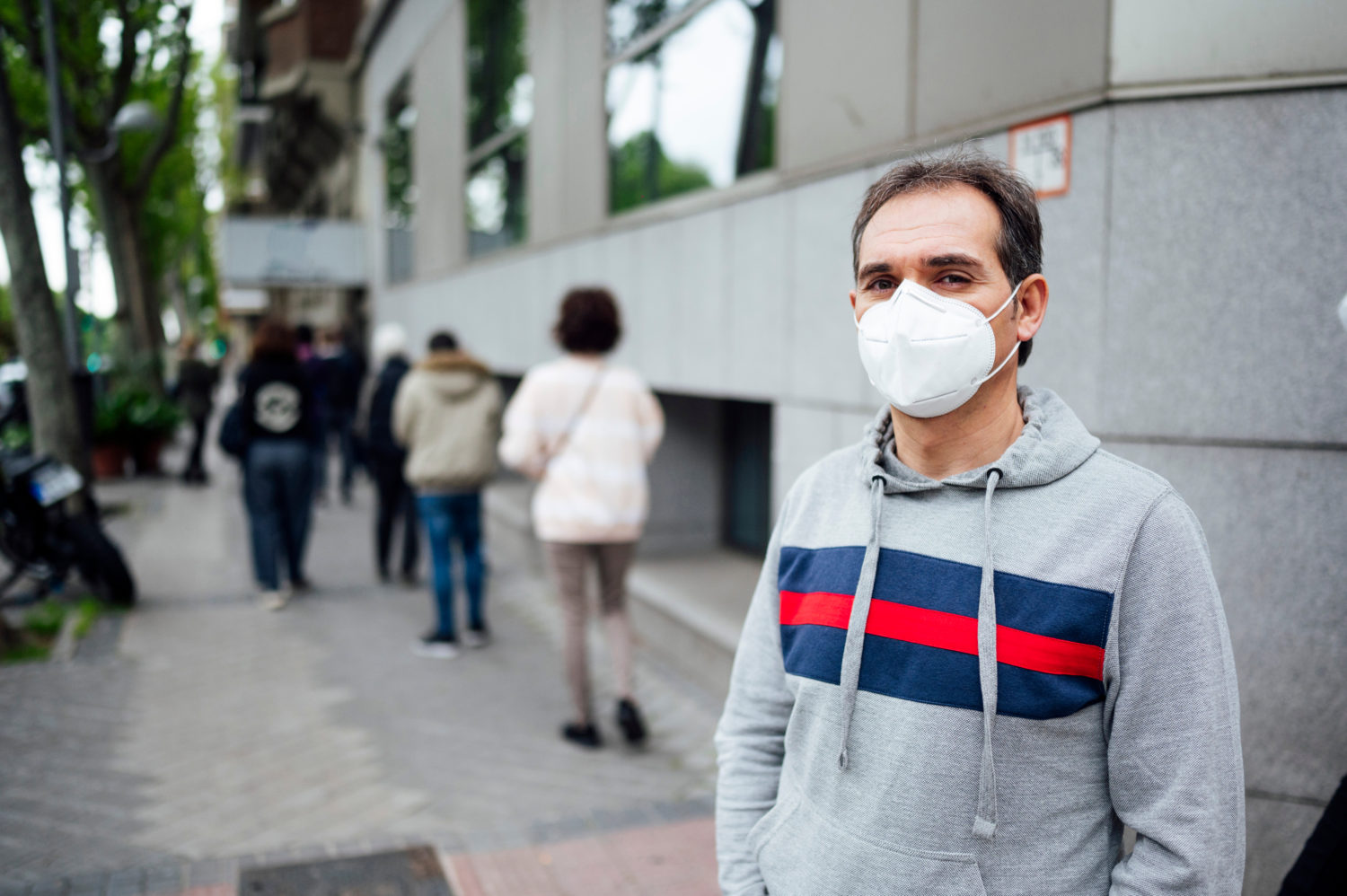 Man with mask in a row of people waiting