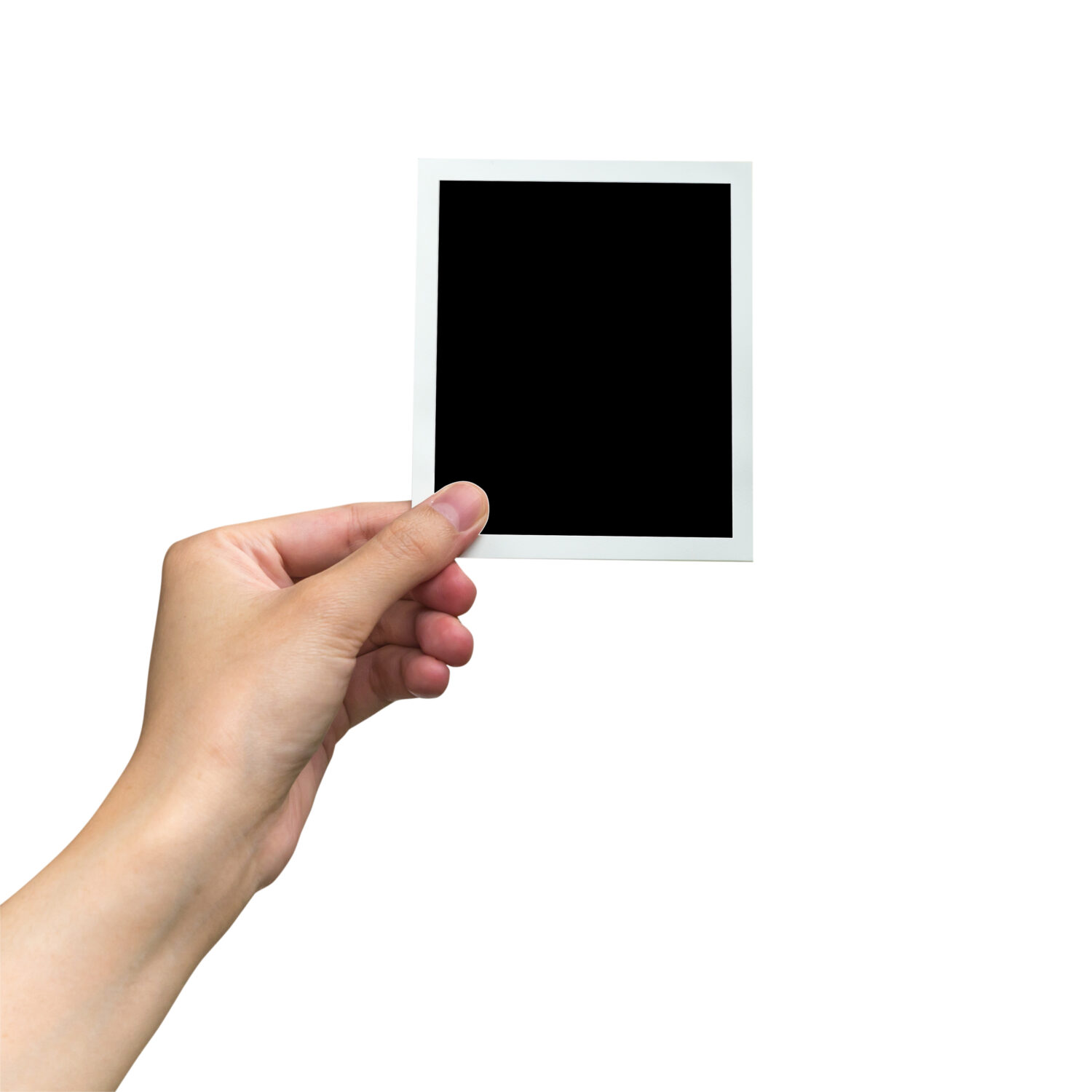 mano sujetando el marco fotografico sobre blanco aislado con el