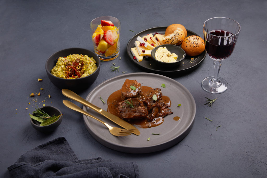 Menú Business Class. Plato de carne con puré de zucchini, copa de vino tinto, quesos, panes y postre de frutas. ID: 44897
