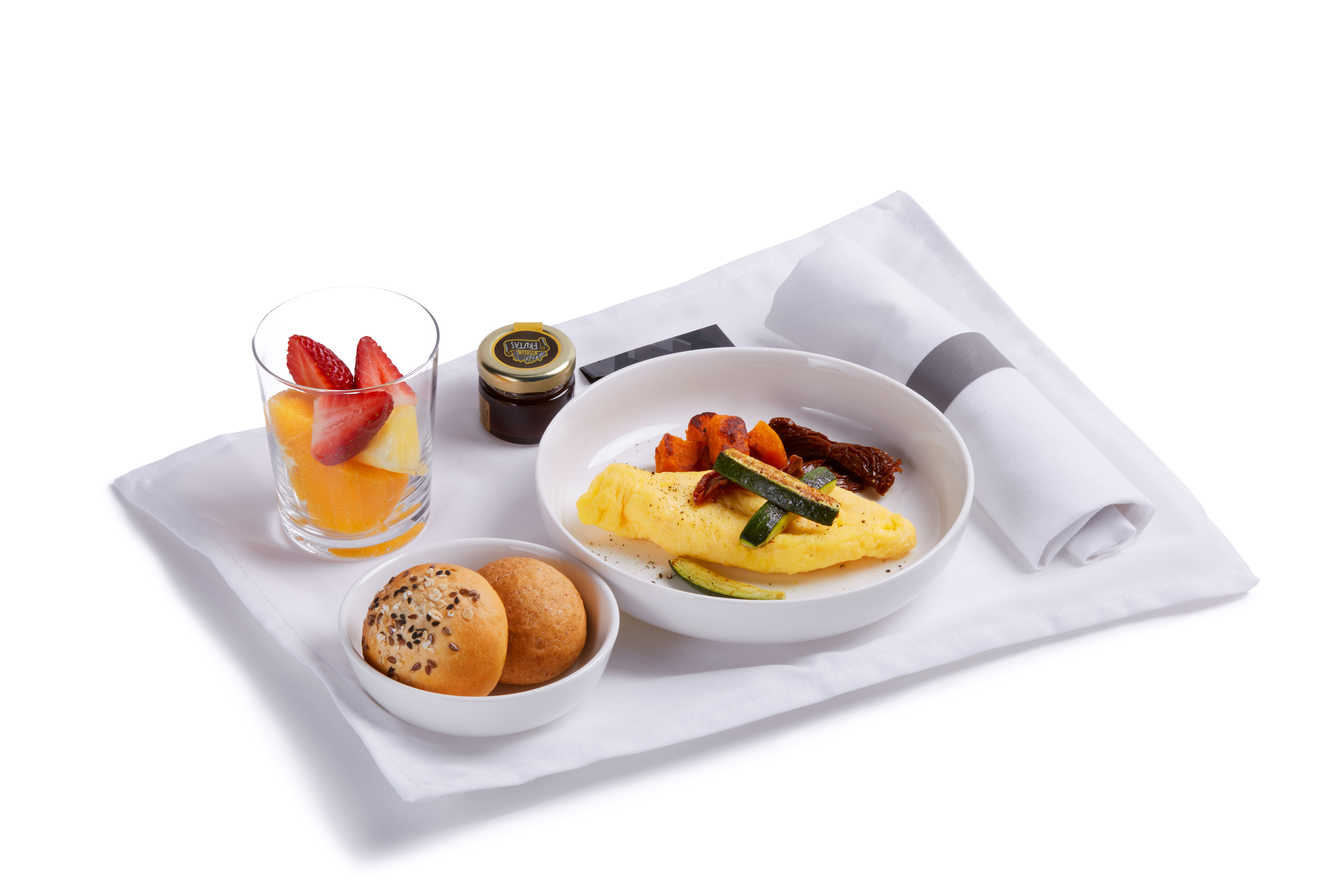 Menú desayuno Business Class en bandeja. Omelette con tomate, frutas y panes.