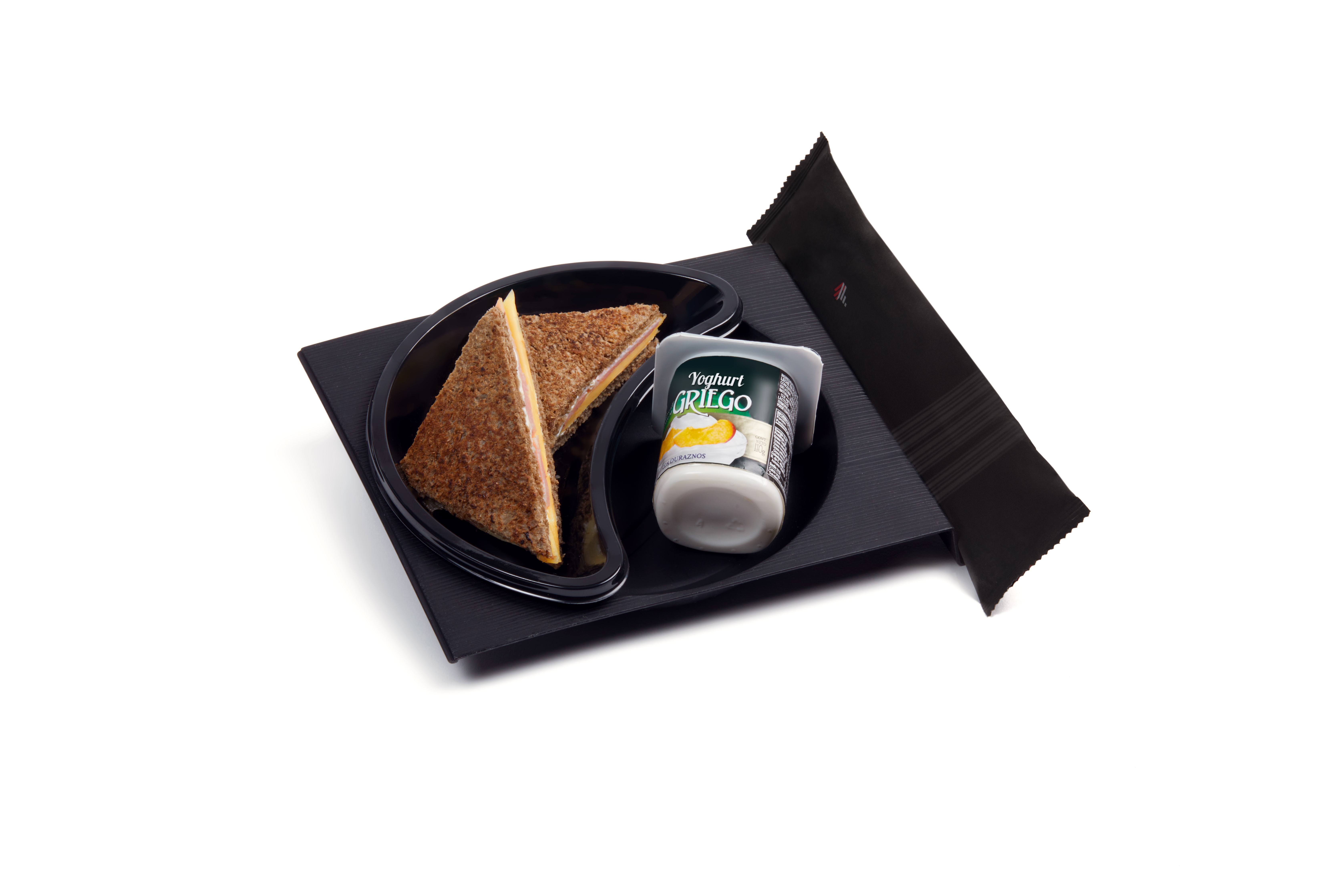 Menú desayuno Economy Class en bandeja. Sándwich de jamón y queso, y yoghurt.