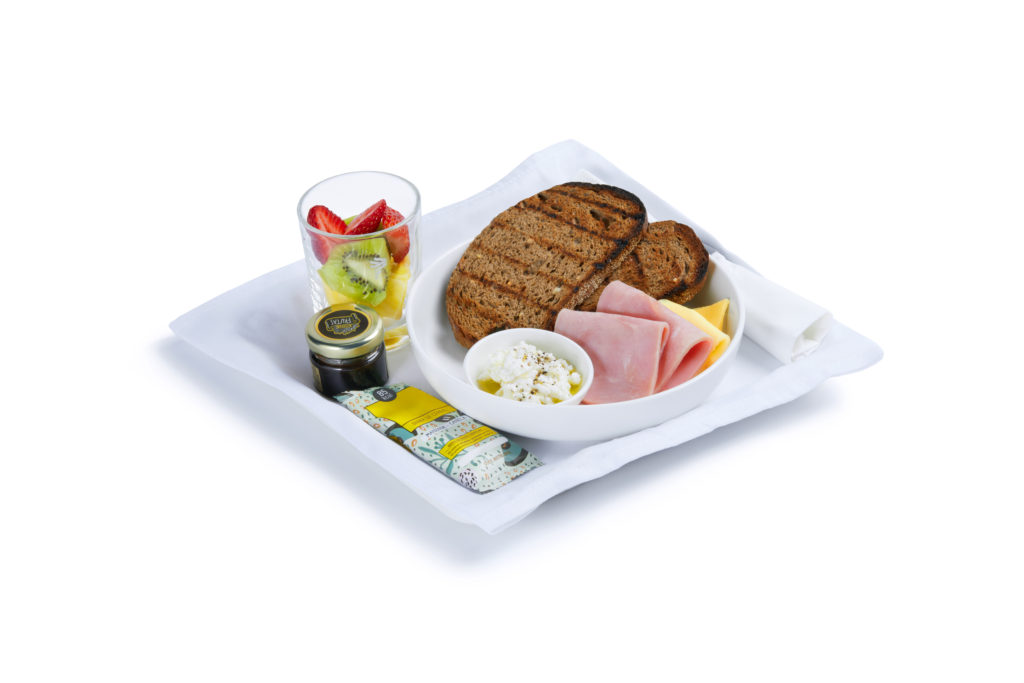 Menú desayuno Premium Economy. Plato con jamones y quesos, tostadas, mermelada, barra de cereal y ensalada de frutas.
