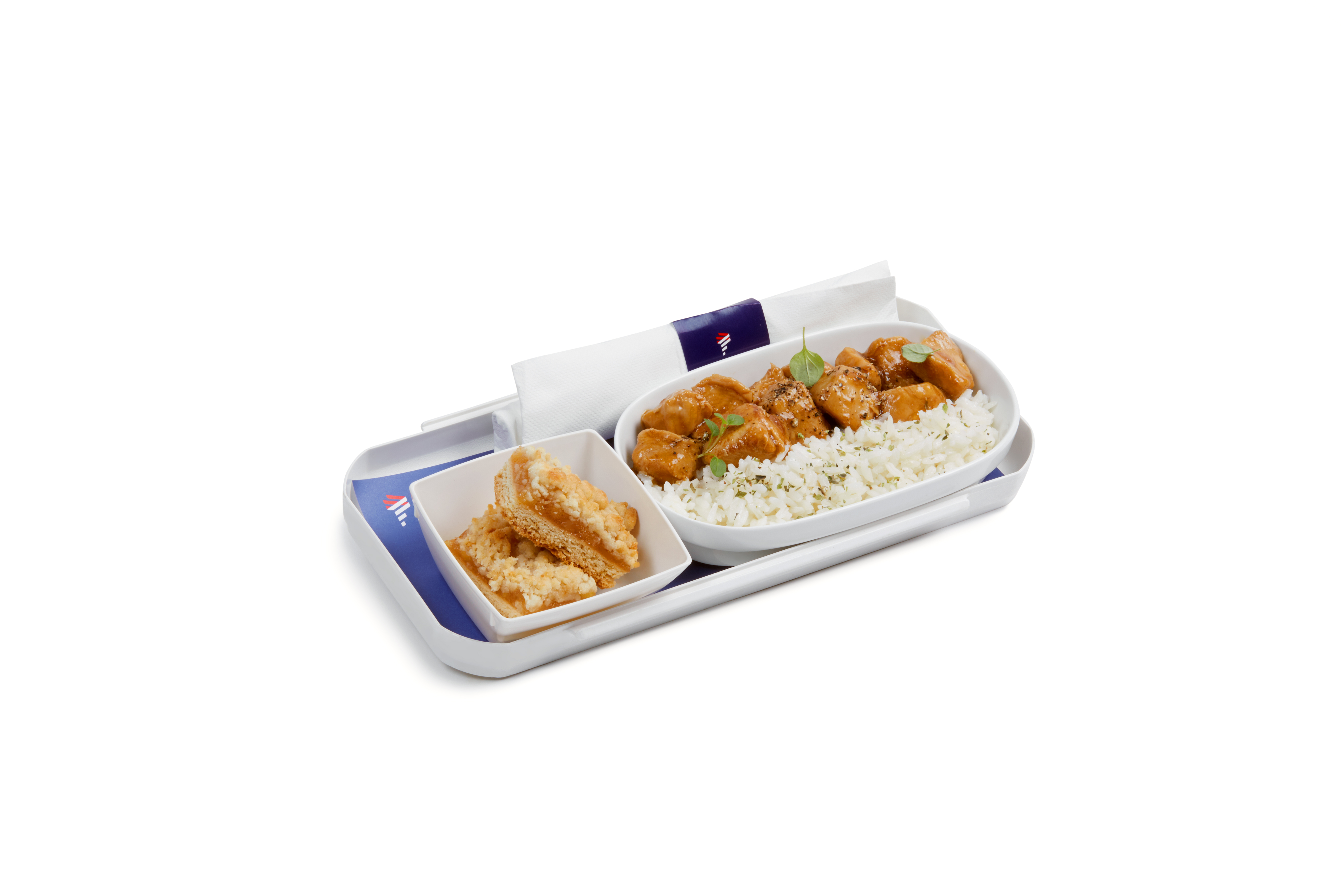 Menú Economy Class en bandeja. Pollo al curry con arroz y torta de manzana.