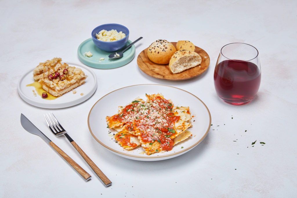 Menú Economy Class. Plato de raviolis con salsa pomodoro y queso rallado, pan, vino tinto y crumble de manzana. ID: 44993