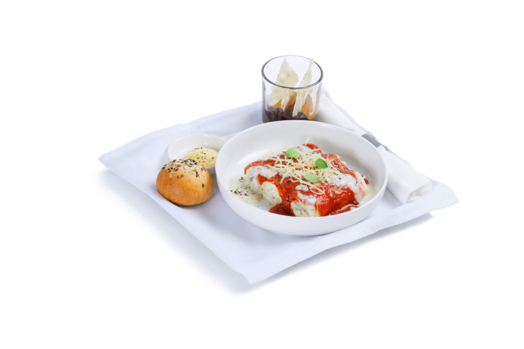 Menú Premium Economy en bandeja. Plato de canelones rellenos con salsa, pan y postre de chocolate.