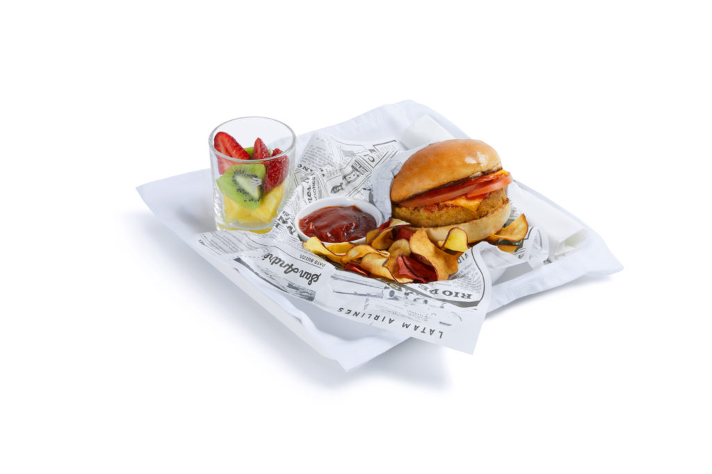 Menú Premium Economy en bandeja. Sándwich con hamburguesa de lentejas, chips, salsa bbq y postre de frutas. ID: 44969