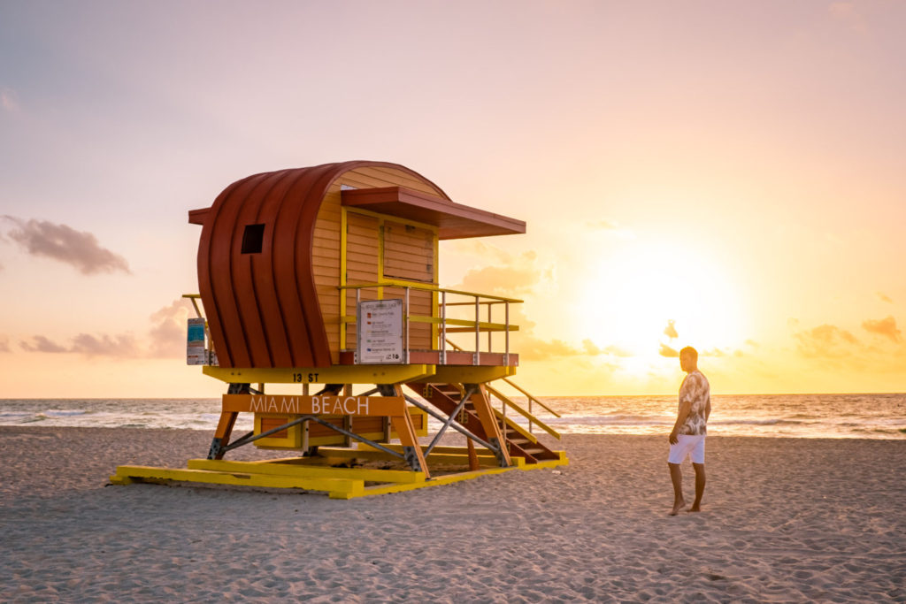 Miami Beach, young men at the white tropical beach of Miami Florida with lifeguard house , man in swim wear beach, cassual mid age men