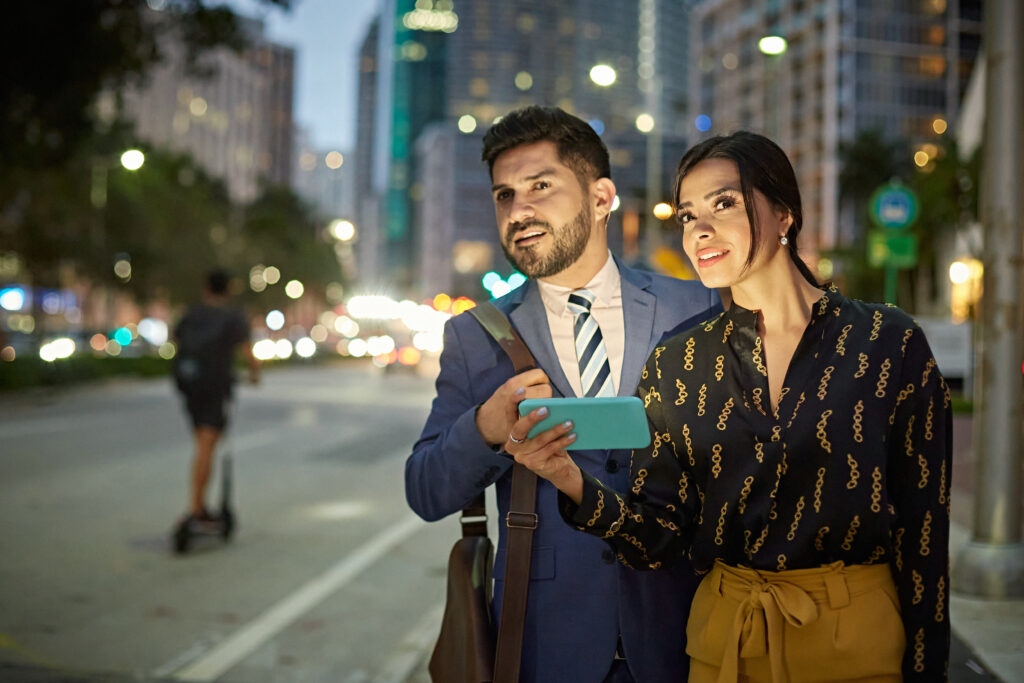 Front view of Hispanic corporate colleagues in 20s and 30s standing curbside and holding smart phone as they wait for ride in downtown district at dusk.