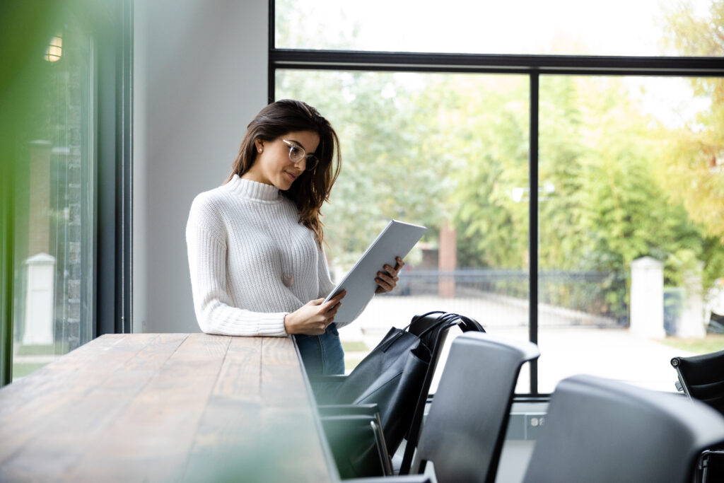 An attractive mid adult female boss takes a break from work to surf the net on her digital tablet.