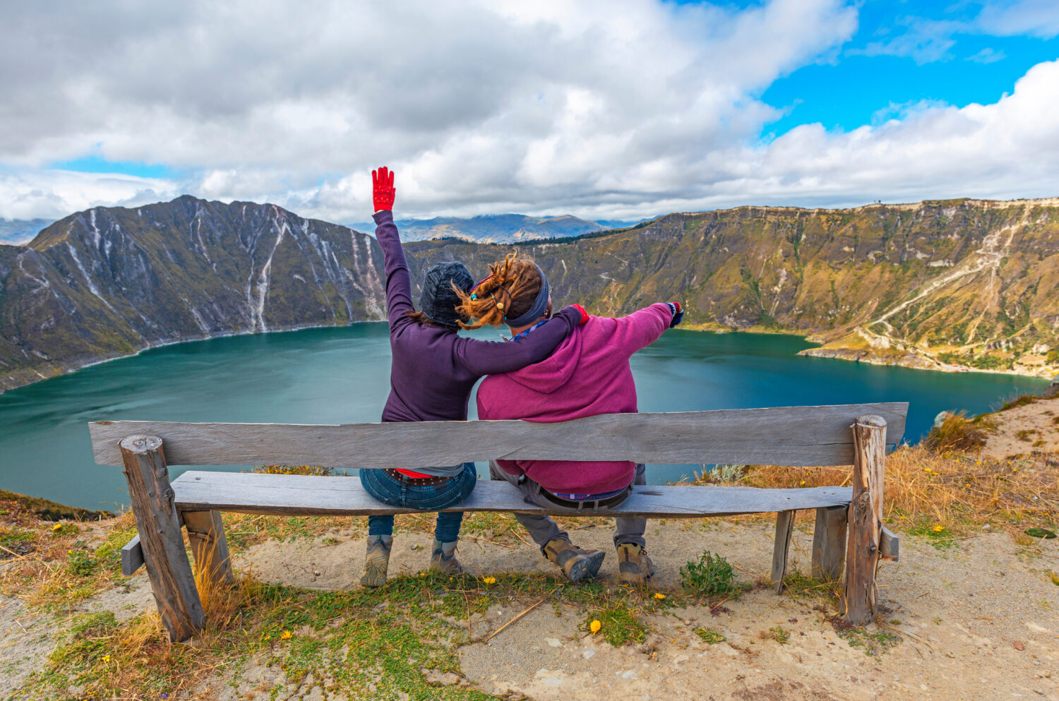 Mochileros disfrutando de la vista del lago de cráter volcánico Quilotoa a lo largo de la caminata por el Loop Quilotoa, al sur de Quito, Ecuador.