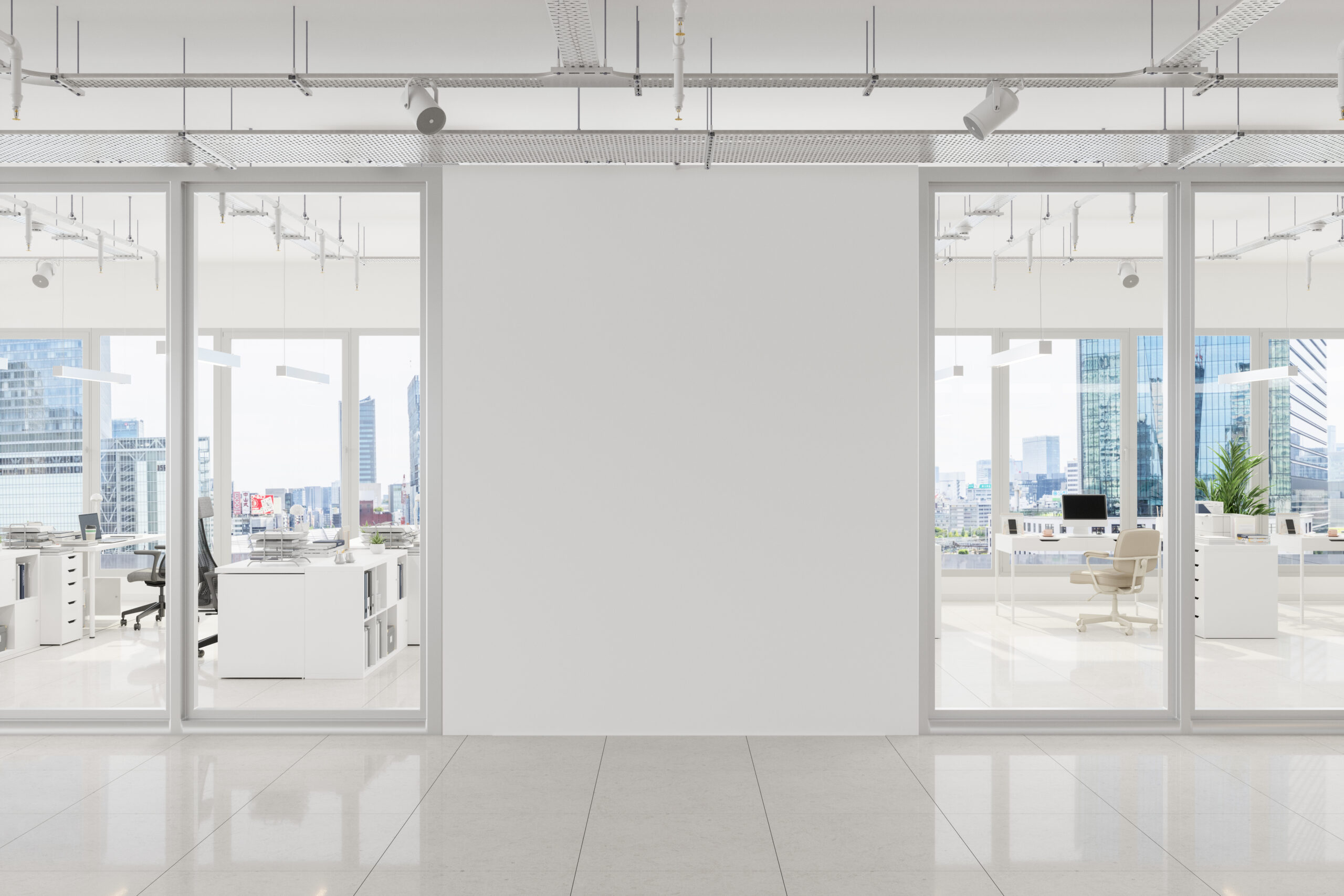 Modern Open Plan Office With White Blank Wall And Cityscape Background ID: 75634 Modern Open Plan Office With White Blank Wall And Cityscape Background