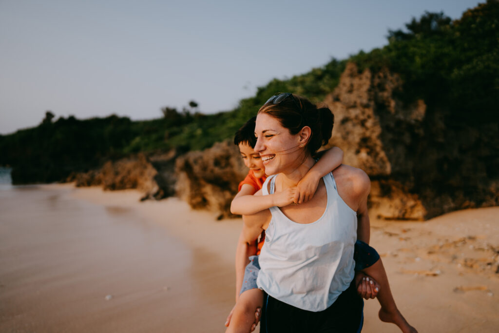 Mother giving daughter piggyback ride on tropical beach at sunset, Iriomote-Ishigaki National Park of the Yaeyama Islands, Okinawa, Japan