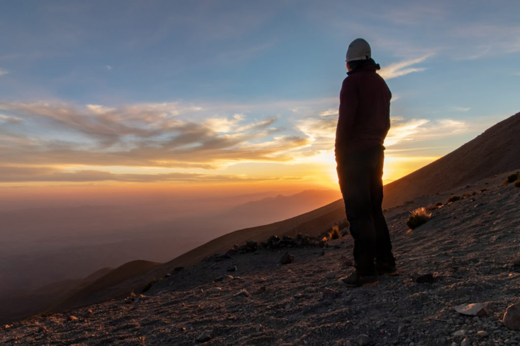 Mountaineer in sunset an the edge of the mountain / volcano Misti in Arequipa, Peru