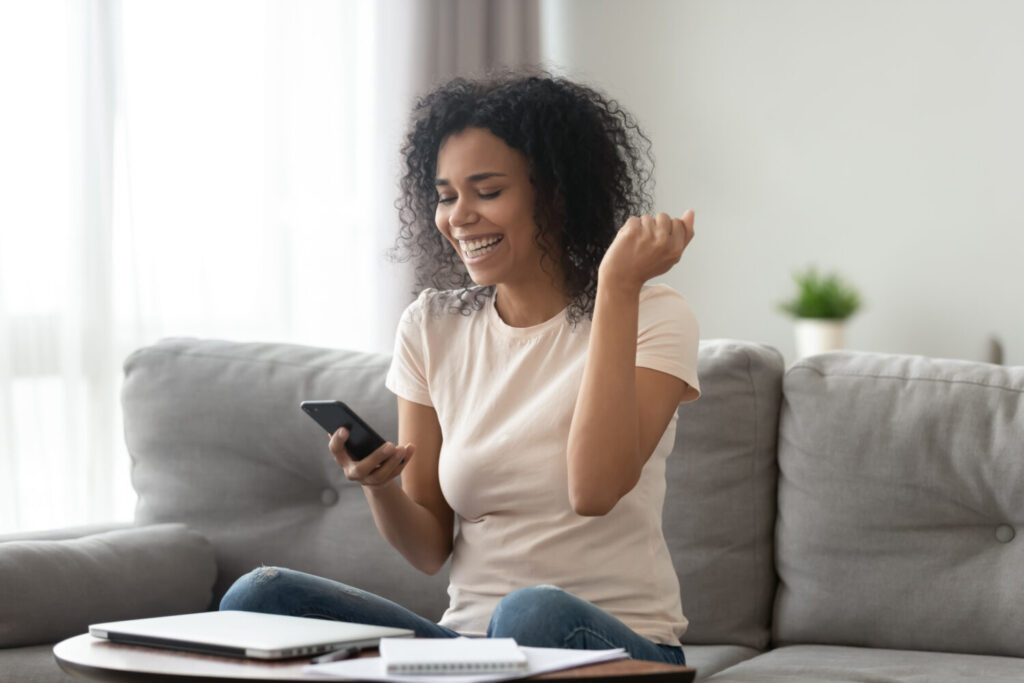 Mujer africana muy alegre sentada en el sofá sosteniendo un smartphone mirando la pantalla celebrando el logro, levantar la mano hace que Sí lo logré, conseguir un trabajo de sueño, leer el concepto de lotería de notificación ganar sms