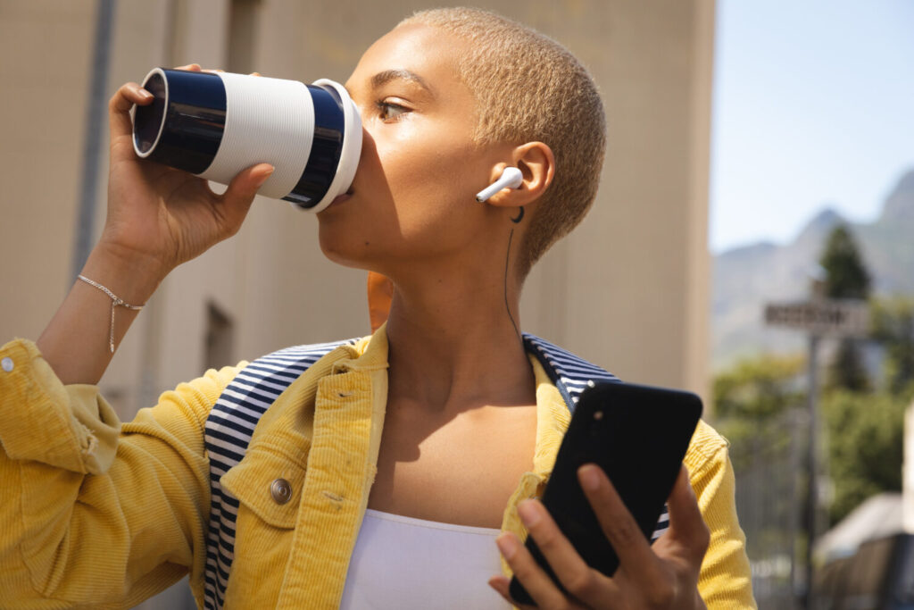 Mujer alternativa de raza mixta con pelo rubio corto fuera y alrededor en la ciudad en un día soleado, usando smartphone con auriculares inalámbricos y tomando un café para llevar. Nómada digital urbano en marcha.