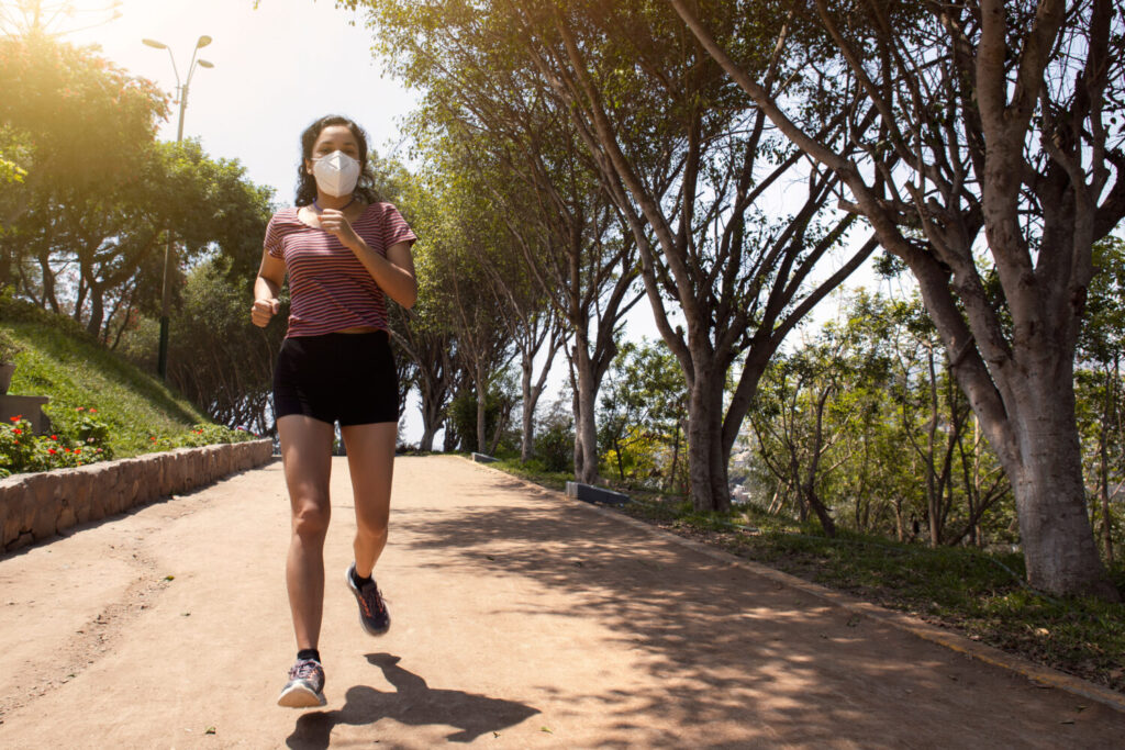 mujer con máscara corriendo en las “Lomas Amarillas”, Surco, Lima, Perú