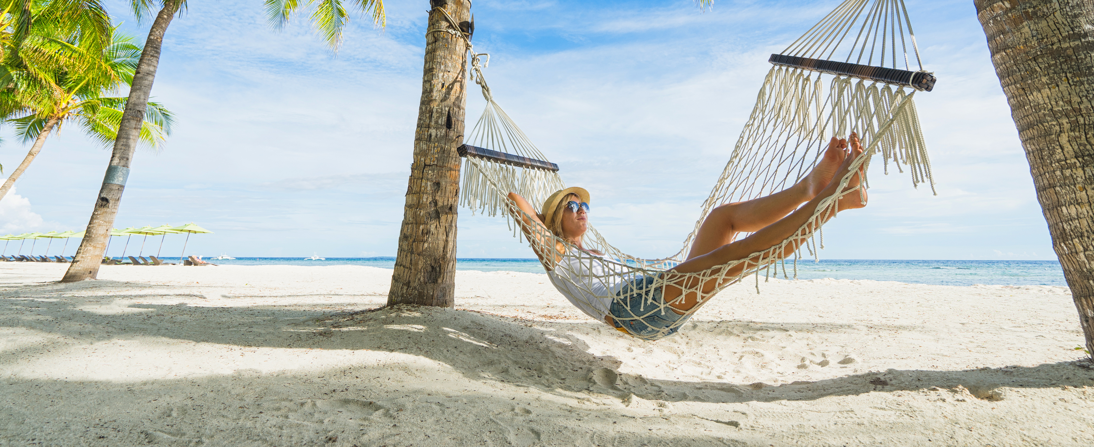 Mujer en esa hamaca relajándose en la playa. Concepto de viajes y vacaciones. Edición de banner.