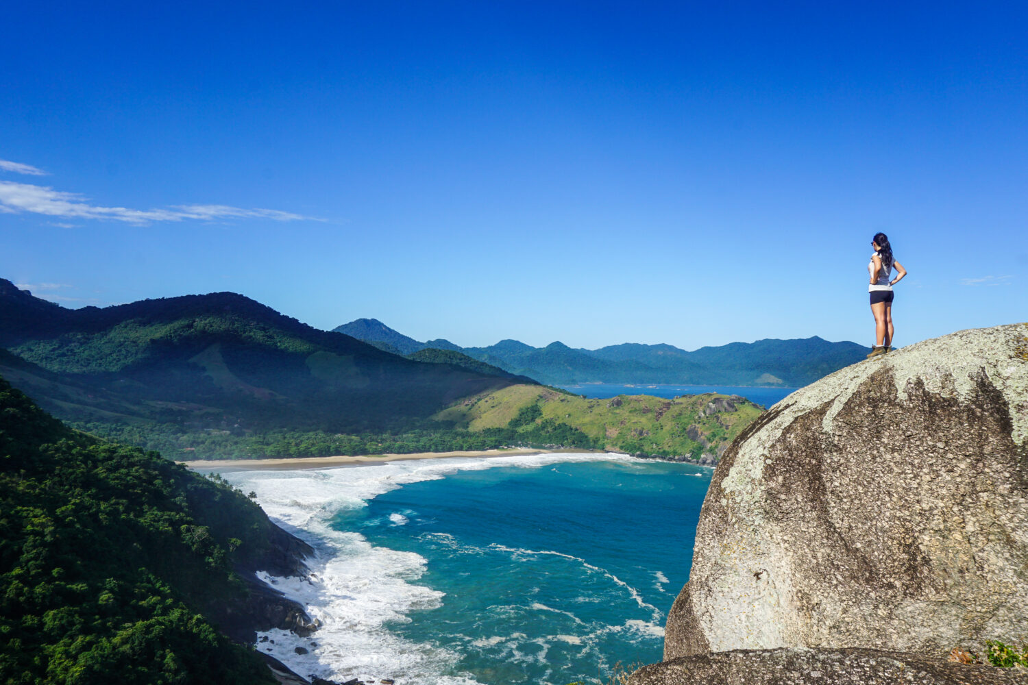 Mujer en una gran roca mirando la Praia do Bonete (Playa Bonete) en Ilhabela (Isla Hermosa), São Paulo, Brasil